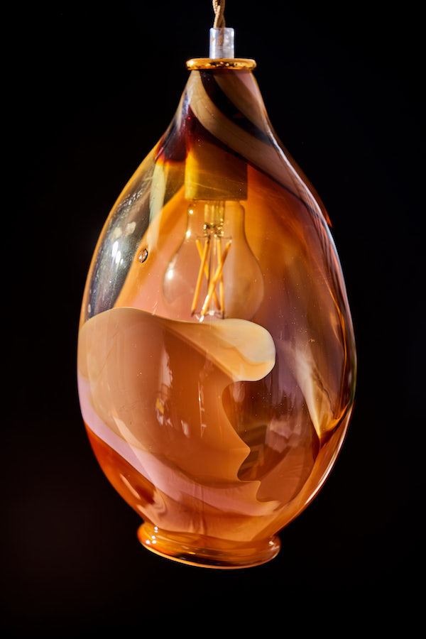 handblown glass pendant lights in ambers, pink and tobacco. Cylindrical shaped- 9” x 4”