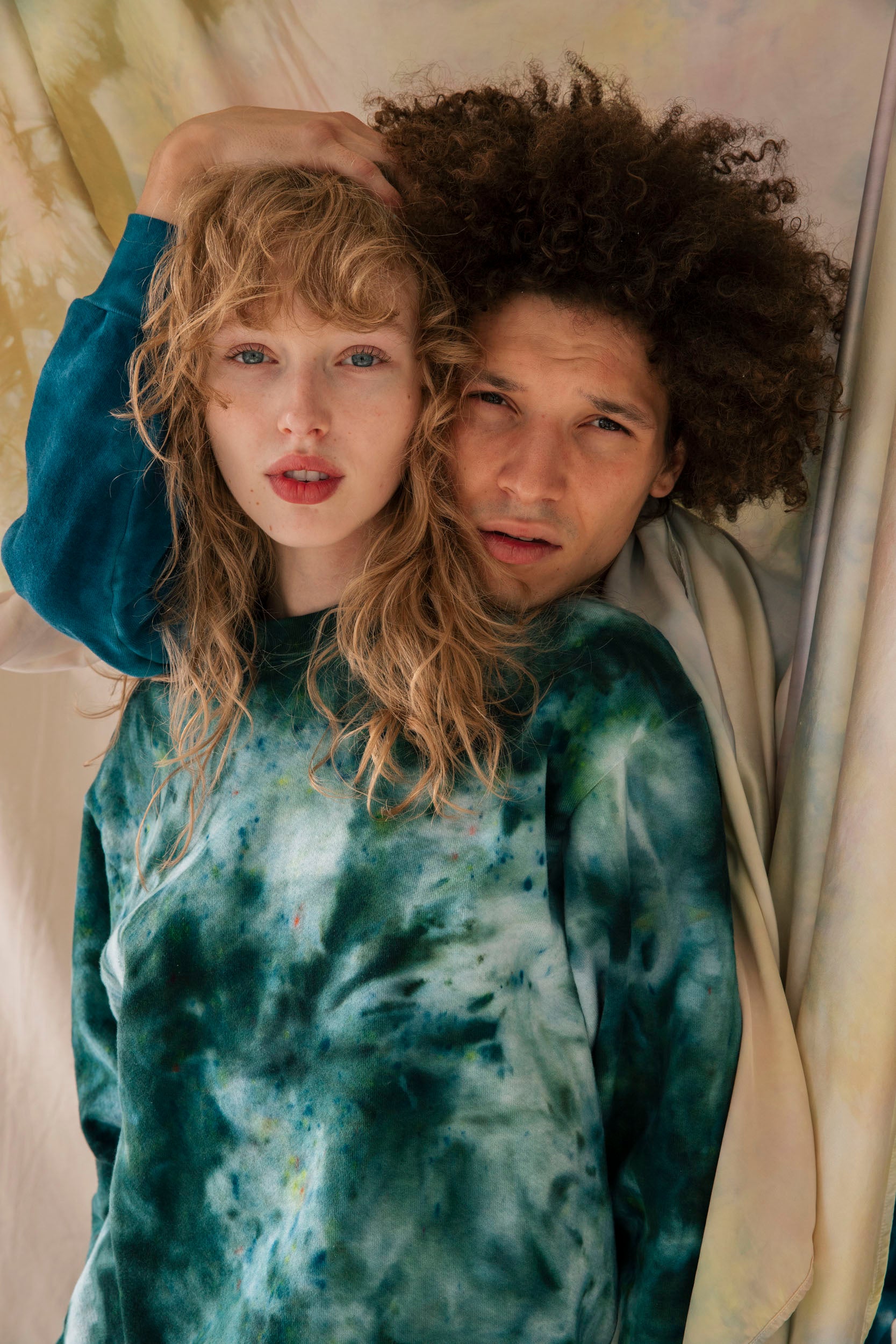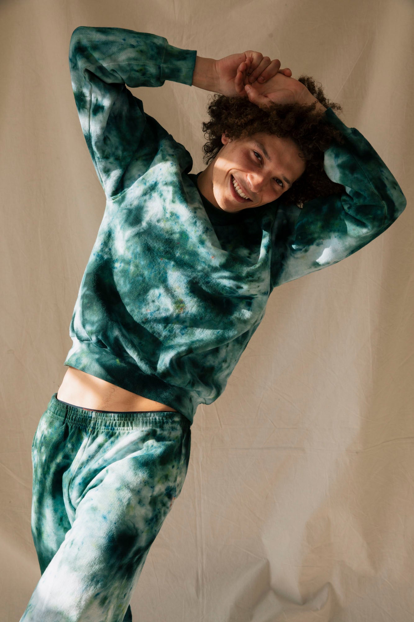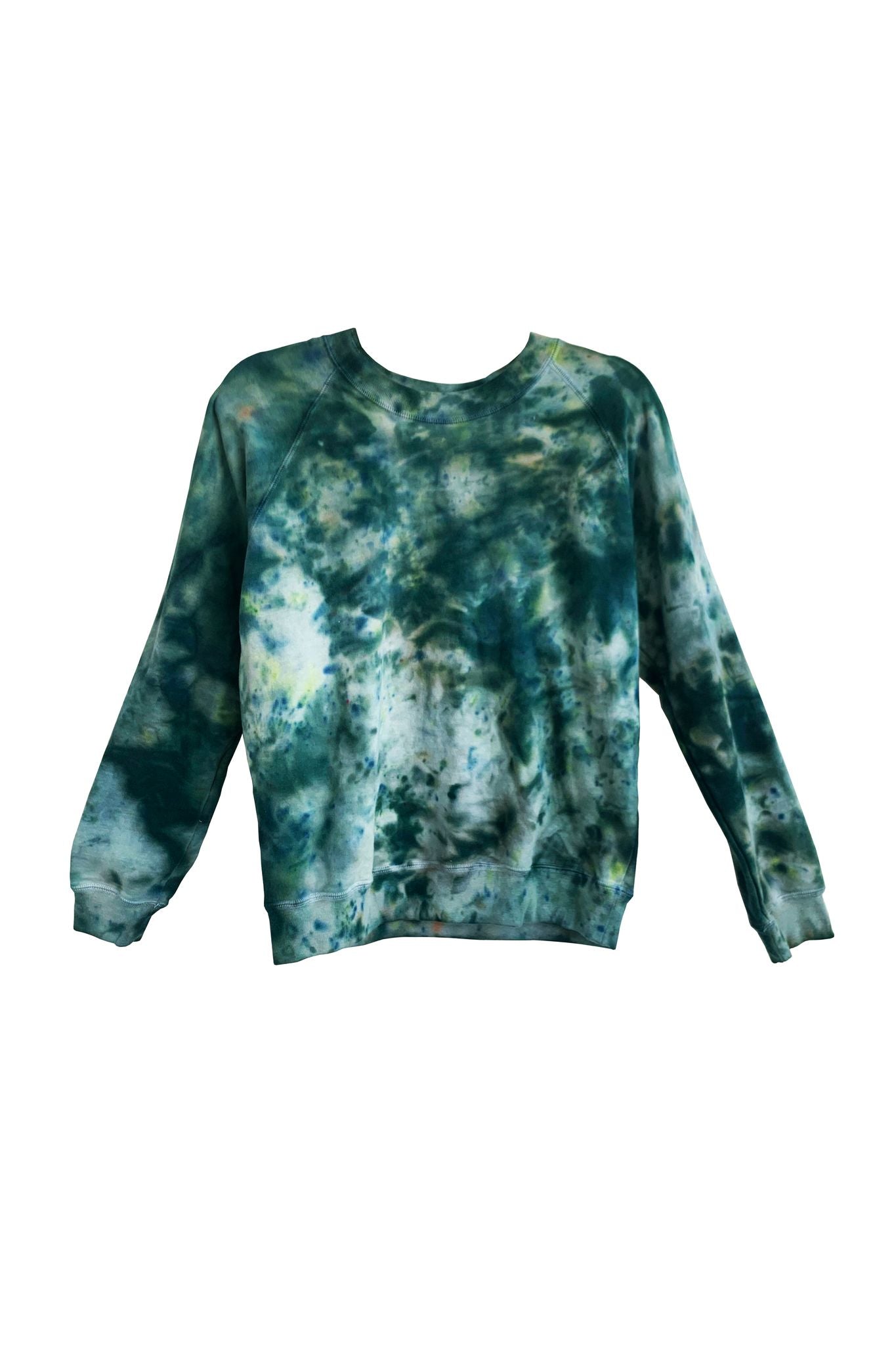 The Lola crewneck is hand dyed in deep emeralds and indigos (with some residual flecks of oranges and yellows). Each sweatshirt is hand dyed and unique. What you receive will vary from the product image in tone and pattern, due to the nature of the hand dye process.
