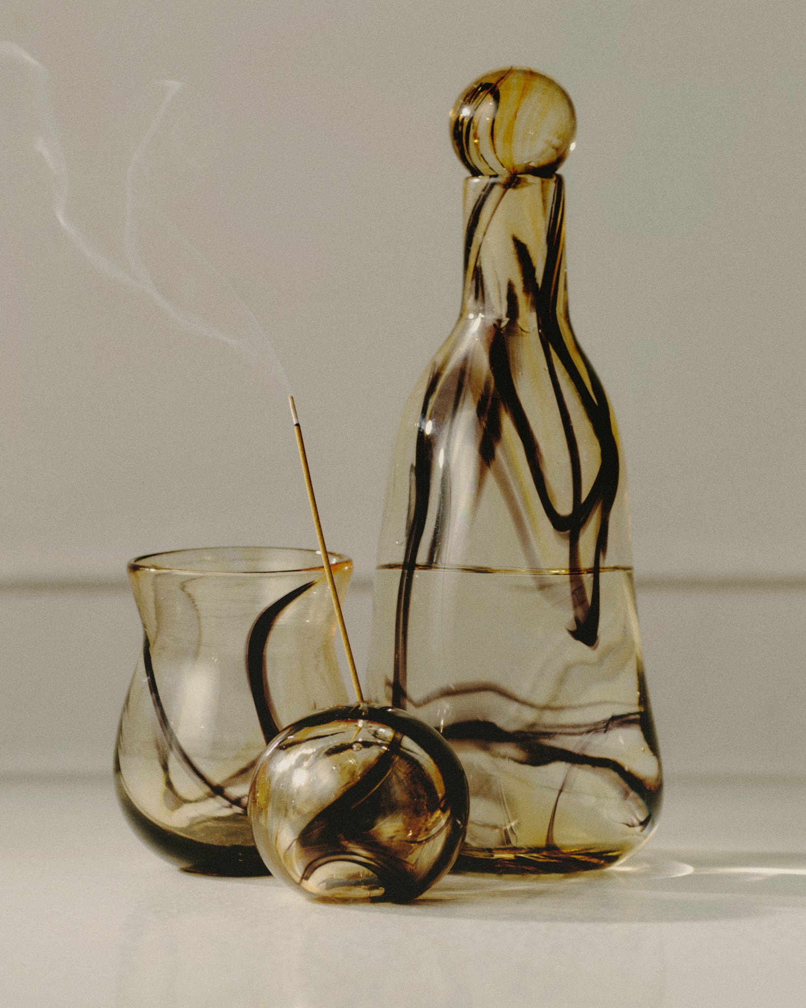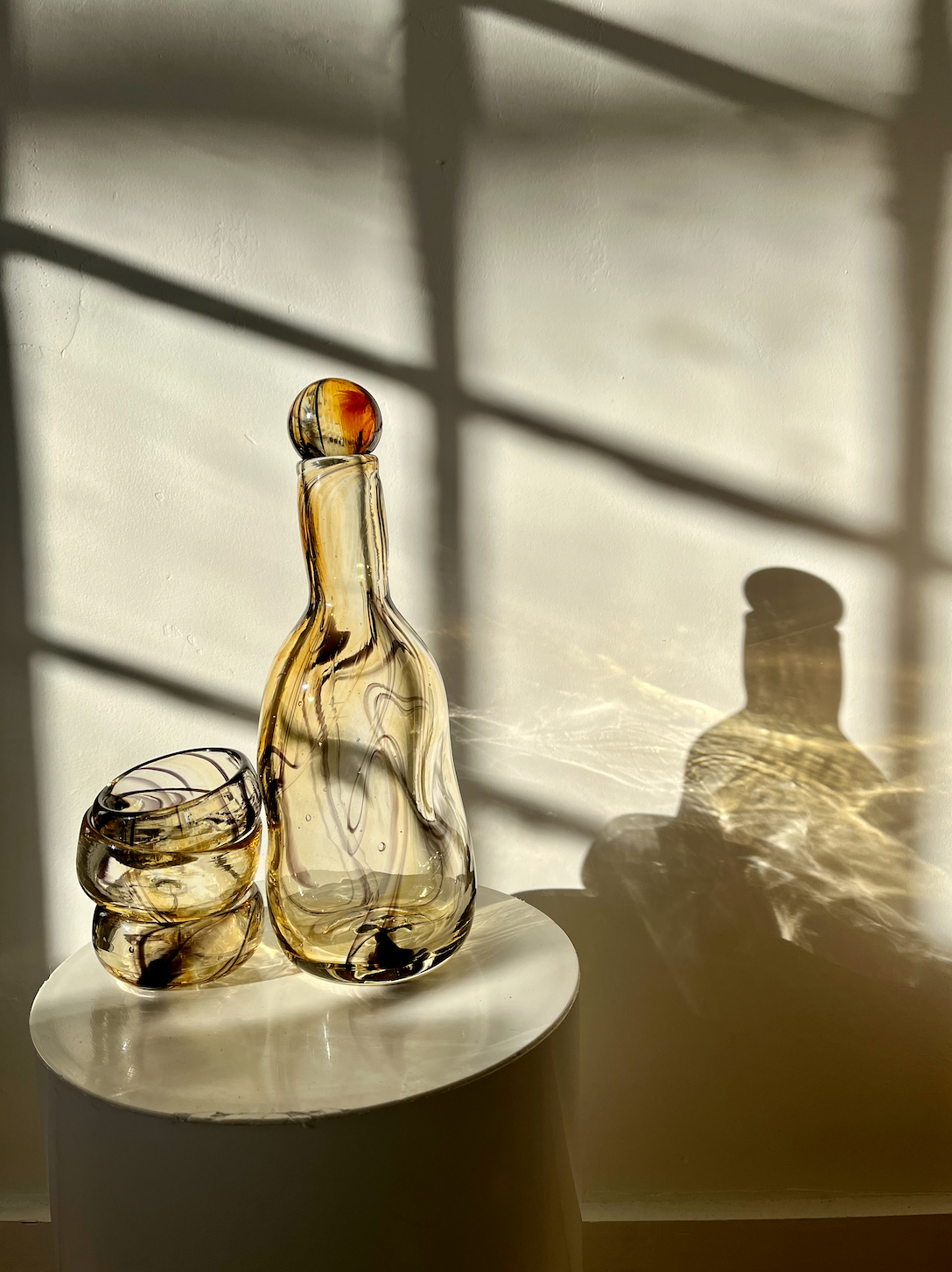 A handblown bottle for your special liquids or just decor. Comes with a marble topper for keeping all of your liquids in a special place.