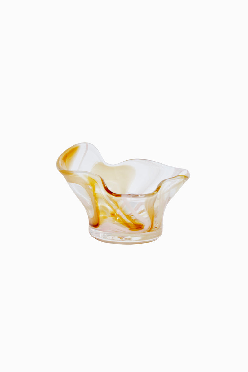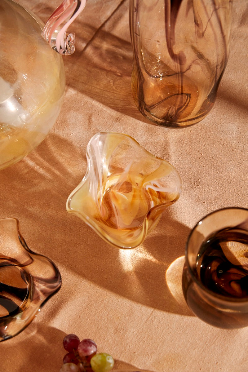 A handblown dish pulled in multiple directions for an organic, whimsical and elevated shape. Great for rings and jewelry or taking your appertivo game to the next level with some olives or nuts!